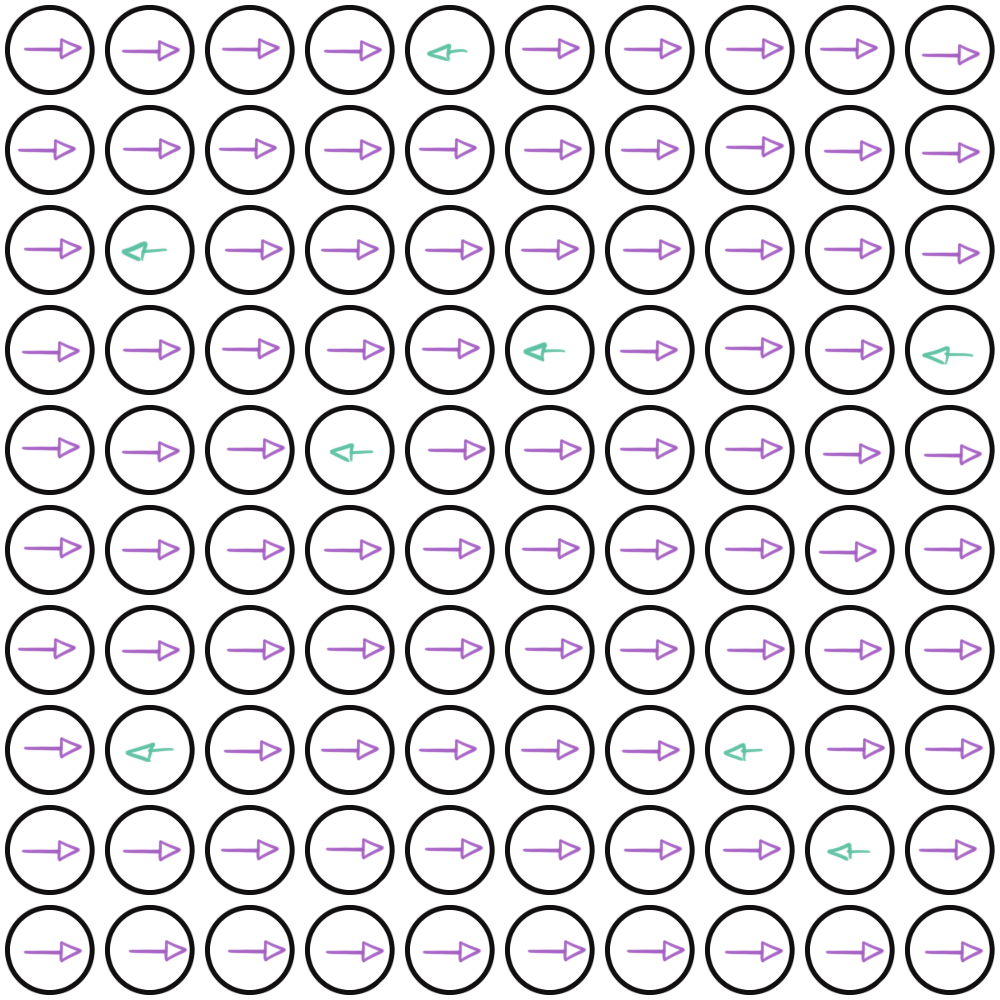 Aha! A pattern emerges! Of the 100 responses, 80 of them point in random directions while 20 point in the same direction. The 80 arrows do have a few matches - there are two or three arrows that point in the same direction here and there, where two or three people happened to give the same incorrect answer by chance - but for the most part, they are all disparate and unaligned. The 20, however, all point in the exact same direction. Those 20 people are the ones who know the answer and are willing to share it.